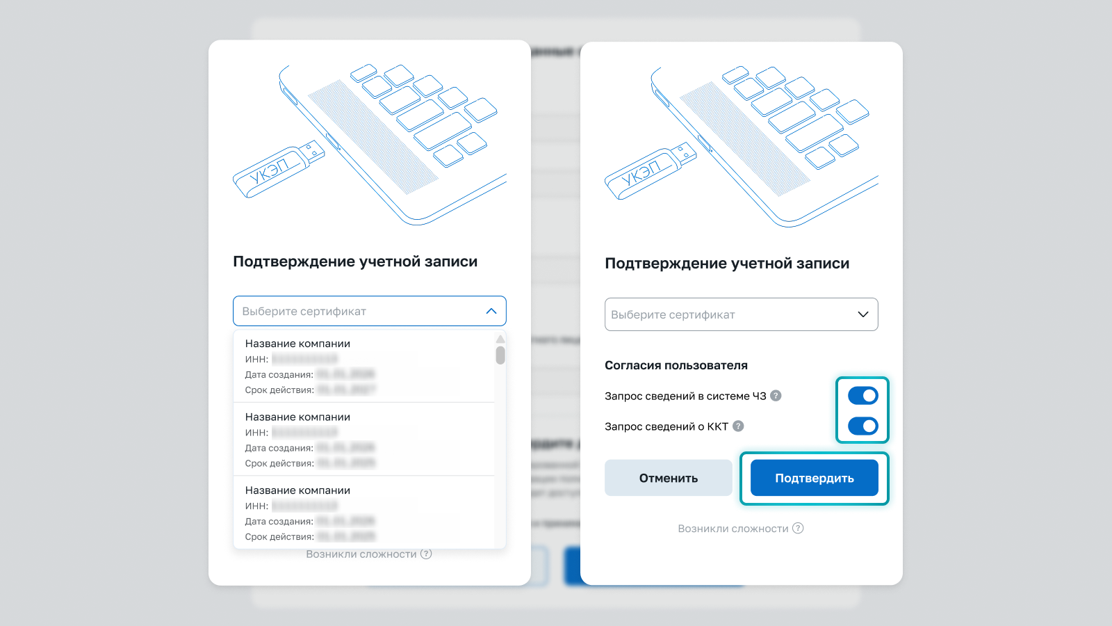 Дайте согласие на запрос сведений о кассовой технике и данных из системы «Честный знак», затем нажмите «Подтвердить»
