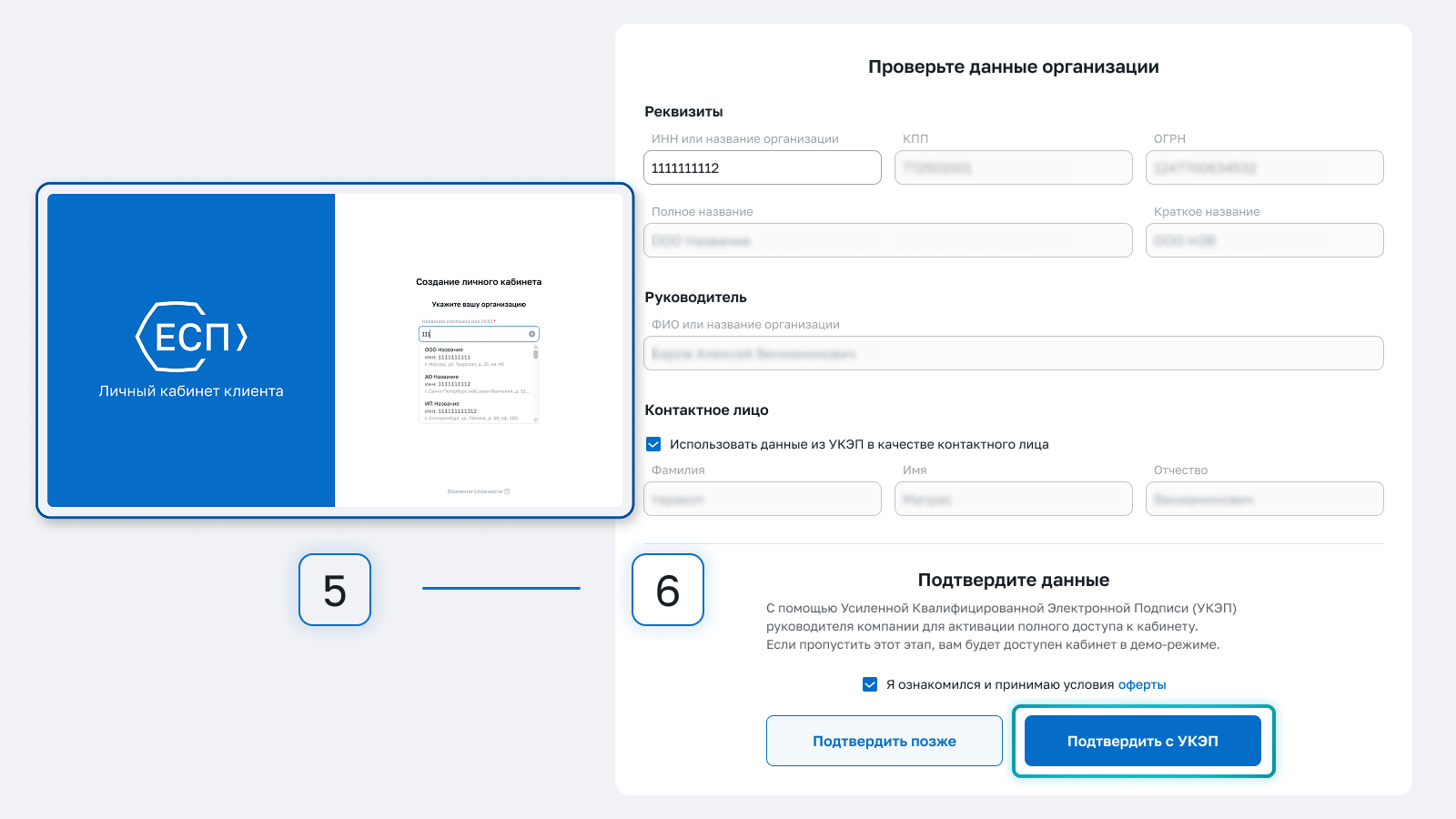 Проверьте автоматически заполненные реквизиты компании, ознакомьтесь с условиями оферты и нажмите «Подтвердить».